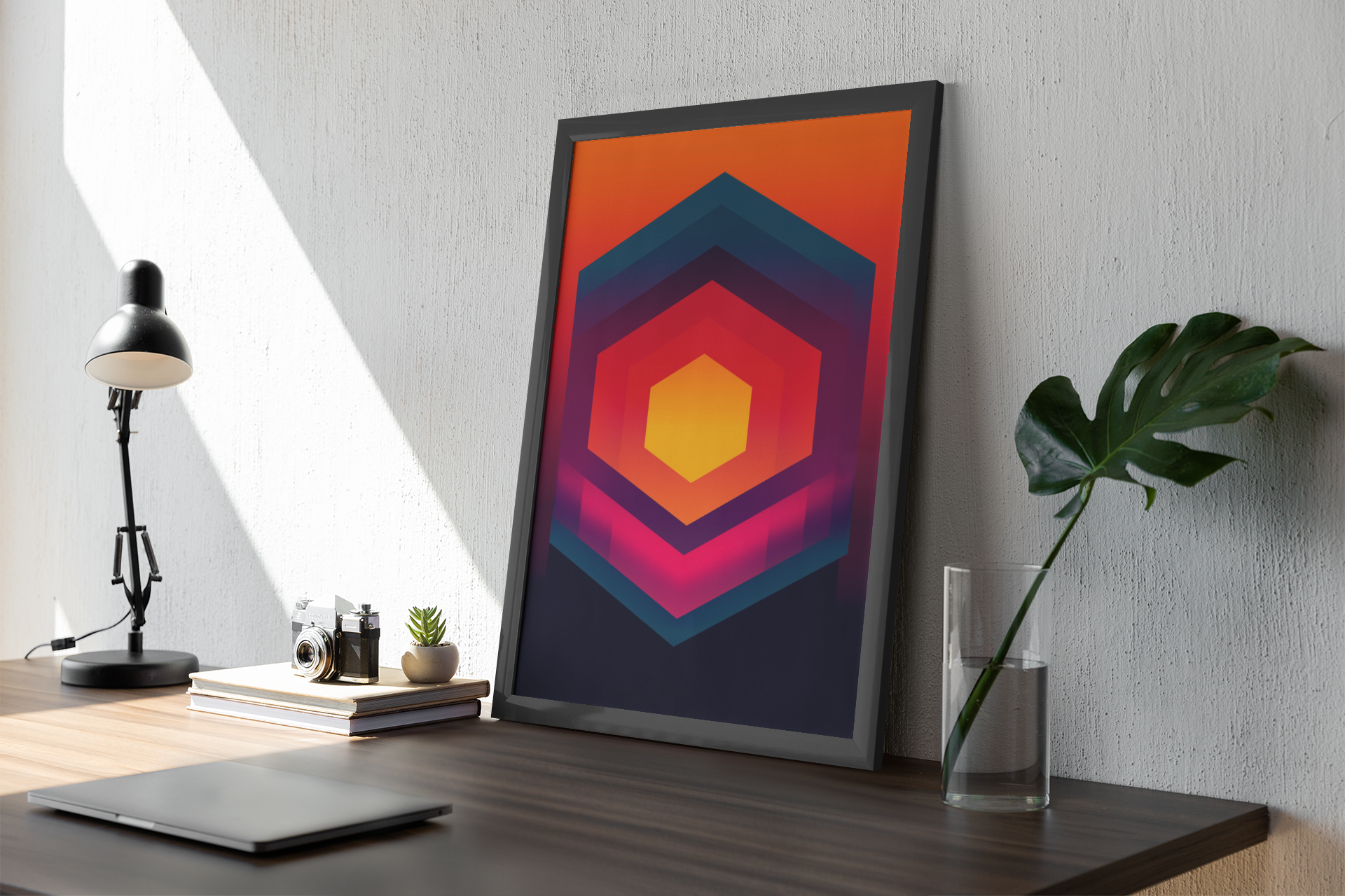 Hex Horizon brings radiant symmetry into the spotlight. Warm tones and modern geometry combine in a stunning gradient-based artwork. Available as canvas, acrylic, or unframed fine art print.